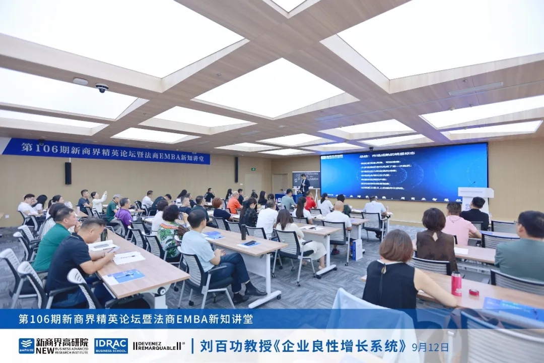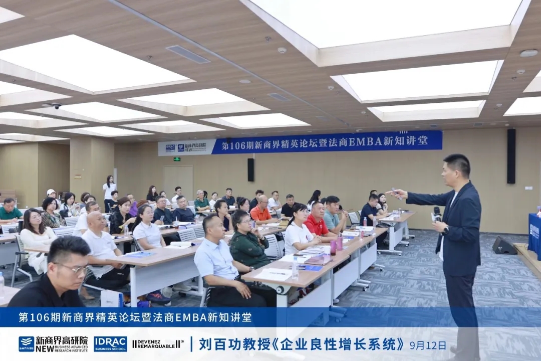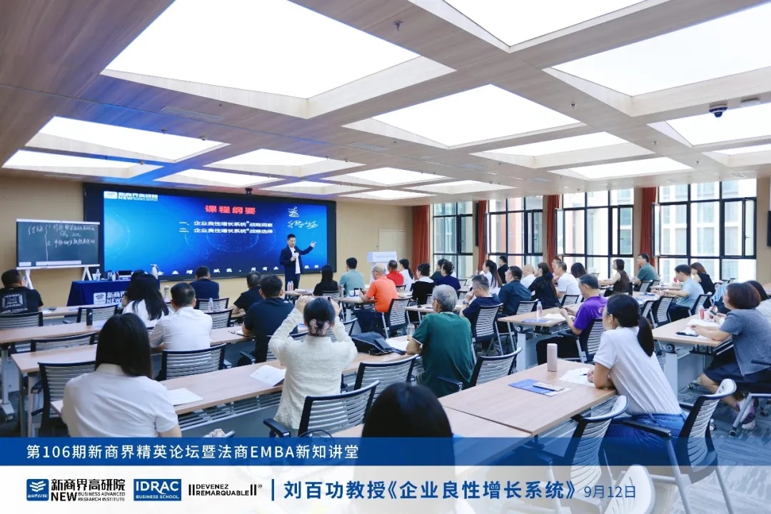 9月12日,第106期新商界精英論壇暨法商EMBA新知講堂在國家大學(xué)科技園順利舉行!家族企業(yè)傳承管理專家、中國造隱形冠軍評(píng)選評(píng)委劉百功老師圍繞"企業(yè)良性增長系統(tǒng)"主題,就企業(yè)"如何從存量破局到增量突圍"展開深度分享,為現(xiàn)場(chǎng)企業(yè)家同學(xué)帶來極具前瞻性的戰(zhàn)略洞察。新商界歷屆學(xué)員校友齊聚,共探增長路徑、共話傳承之道。
