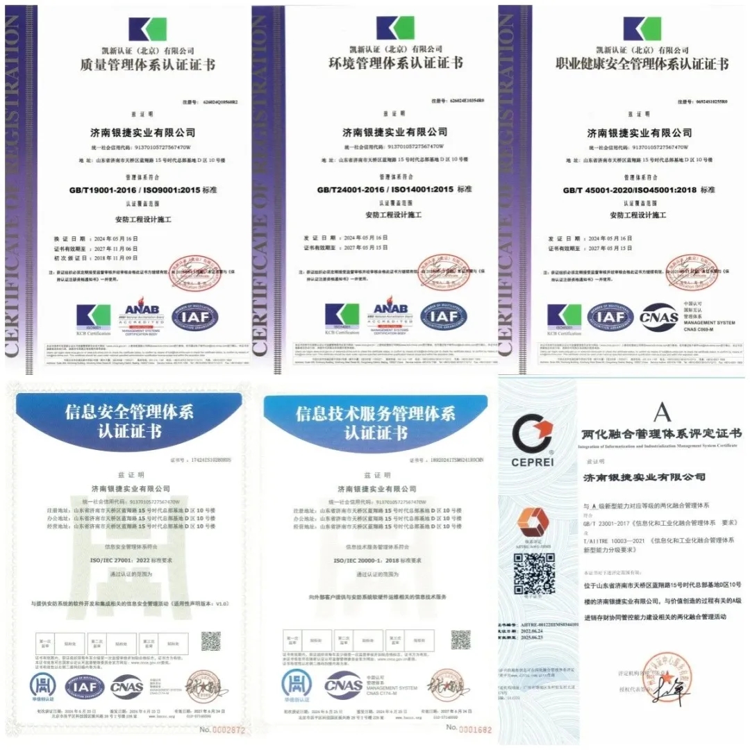 自2001年成立以來,銀捷實業便以"智慧安防踐行者、安防技術領跑者"為愿景,在技術研發的道路上步履不停。如今,這家注冊資金1300萬元、辦公面積達3100平方米的企業,已手握山東省安全技術防范工程設計施工維護壹級資質,斬獲近50項自主知識產權,更憑借硬核實力獲評"國家高新技術企業",通過ISO9001質量管理體系、ISO27001信息安全管理體系等五大權威認證,每一項榮譽都印證著其技術實力。
